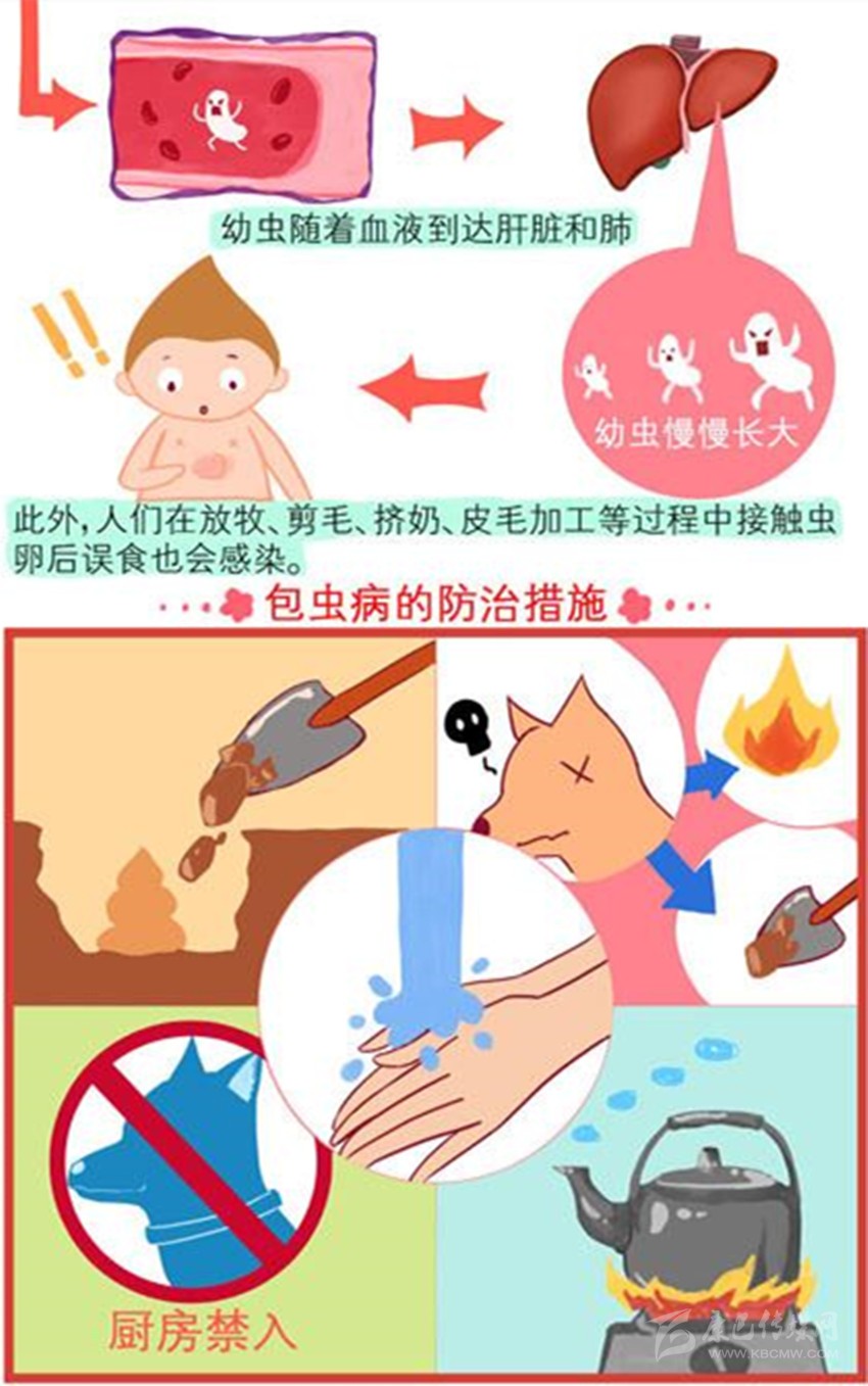 我們先看包蟲病的發(fā)生過程:狗、狼、狐貍等食肉動物食入感染棘球幼蟲(棘球蚴囊里可會有數(shù)百萬個棘球幼蟲)的羊、牛、豬、馬、鹿、兔、鼠的生內臟或未熟的肉類后,棘球幼蟲在它們小腸腸壁隱窩內,經(jīng)7-8周生長,發(fā)育成為米粒大小的成蟲——棘球絳蟲。成蟲有頭、頸、體節(jié),體節(jié)中有成節(jié)和孕節(jié),成蟲無雌雄之分,屬于雌雄同體,每隔7-14天蟲卵形成,孕節(jié)脫落隨糞便中排出,成節(jié)再發(fā)育為孕節(jié);同時,成蟲還可自然下滑其肛門引起肛門發(fā)癢,這時狗、狼、狐貍等回頭用舌舔、牙咬,孕節(jié)被壓碎,蟲卵排出。脫落的孕節(jié)可沿草地或植物蠕動爬行,孕節(jié)邊走邊下蛋,導致蟲卵四處擴撒。蟲卵細小,肉眼看不見,它在干燥環(huán)境中能存活11-12天,在2℃水中能活2.5年,在冰中可活4個月。就是這樣蟲卵它引起狗自身和與其接觸的羊、牛、豬、馬等家畜的皮毛污染外,它還隨著狗、狼、狐貍等活動場所不同污染牧場、畜舍、蔬菜、土壤及水源等環(huán)境;毫無警惕,多而細小的蟲卵它們易被人和羊、牛、豬、馬、鹿、兔、鼠等草食動物誤食吞下,吞食的蟲卵它們很快在機體的腸內孵出變?yōu)橛紫x,幼蟲鉆入腸壁,隨血循環(huán)到達我們和羊、牛、豬、馬、鹿、兔、鼠等草食動物的肝、肺、腦、心、腎等器官居住下來,緩慢生長,引起對應部位的包囊蟲(又稱棘球蚴),出現(xiàn)包蟲病。包蟲病嚴重程度取決于包囊蟲的體積、數(shù)量、寄生時間、部位和繼發(fā)反應,而危害人畜健康和生命安全。