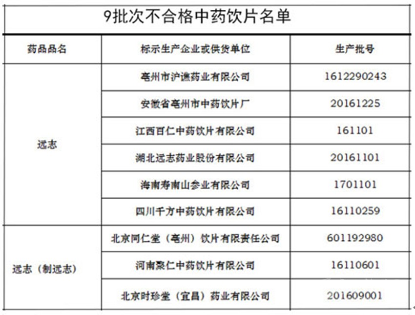 北京同仁堂(亳州)飲片有限責(zé)任公司、河南聚仁中藥飲片有限公司等企業(yè)生產(chǎn)的3批次遠志(制遠志)不合格,不合格項目為黃曲霉毒素。