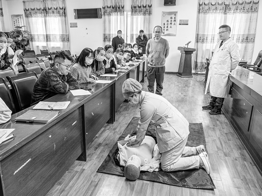 “組團式”幫扶干部對石渠縣人民醫(yī)院醫(yī)護人員進行急診急救“心肺復蘇”培訓。