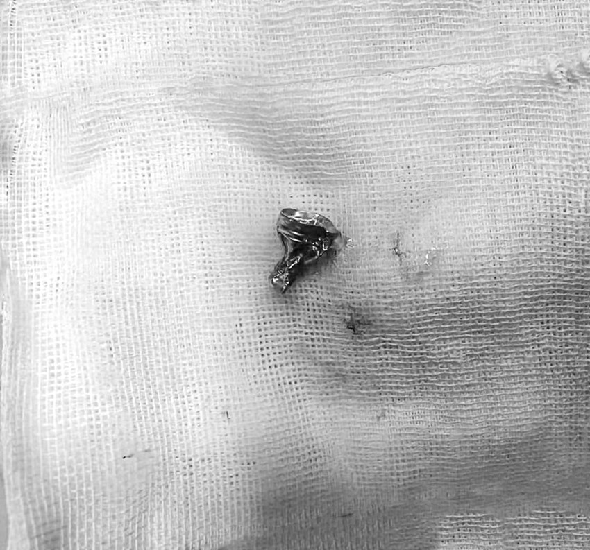 手術(shù)于1月5日13時開始,在醫(yī)院呼吸與重癥醫(yī)學科、消化胃腸鏡室的支持下,兒科與麻醉科醫(yī)護人員密切合作,兒科醫(yī)生劉勤、張雪瓊冷靜操作、沉穩(wěn)手術(shù),最終將異物成功取出。經(jīng)仔細檢查,異物為一扭曲變形的鉛筆頭鋁箍。