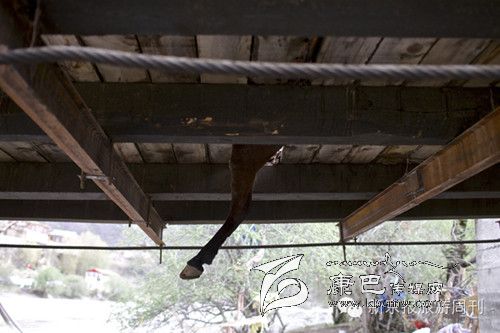 白玉縣,德沙村一鐵索橋,拉沙石馬隊中一匹騾子腿被陷進漏空的木板下。