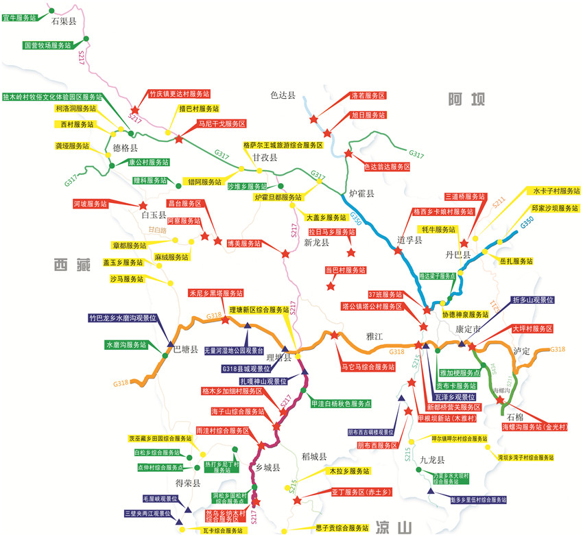 77個服務區(qū)(站、點)地處我州六條旅游線路和十條景觀大道。主要集中在:G318線(瀘定——康定——雅江——理塘——巴塘),G350線(丹巴——八美——道孚——爐霍——色達),S217線(理塘——稻城——香格里拉鎮(zhèn)——亞?。琒211線、S434線(瀘定——海螺溝——榆林)。