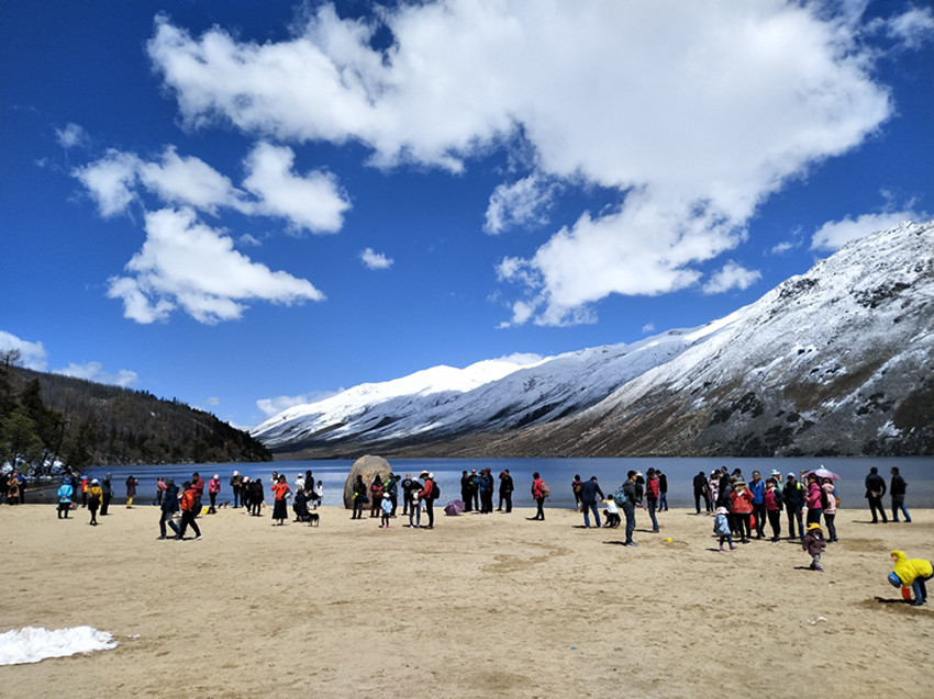 4月30日,筆者來到木格措景區(qū),看到售票大廳內(nèi)人頭攢動,人氣火爆,游客有序的在窗口前、觀光車站前排隊等候,公安民警、景區(qū)管理人員在值勤巡邏,為前來咨詢的游客進行講解、帶路。