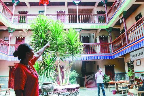 記者在“安卡兒民族莊園”看到,每天游客絡繹不絕,游客們不肯錯過的是這里的鄉(xiāng)愁。眼前的“安卡兒民族莊園”是一座藏式三層小樓,以嘉絨民居為主格調。從外觀看,這棟三層小樓與村里其他農(nóng)家小院沒有多少差異,但仔細端詳,其所有窗戶大小、高低不一,透出與眾不同的設計風格。走進院內,這座藏式小樓的走廊外側裝著木欄桿,欄桿下面掛著藍綠相間的布條,以及大院中央郁郁蒼蒼的盆景,讓人美不勝收。