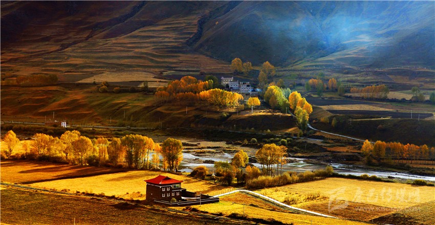 沿著公路行駛,您會(huì)看到公路兩邊的青稞都已金燦燦,綠葉變黃,溪水靜靜流淌,小樓上的經(jīng)幡隨風(fēng)舞動(dòng),白塔依稀林立,陽光照耀下的東路各縣市的空氣中充收獲的氣息。 藍(lán)天白云,小橋流水,金黃色的白楊樹,精美的藏式小樓,在光與影的映射下,仿若一幅油畫,等待您的發(fā)現(xiàn)和欣賞。