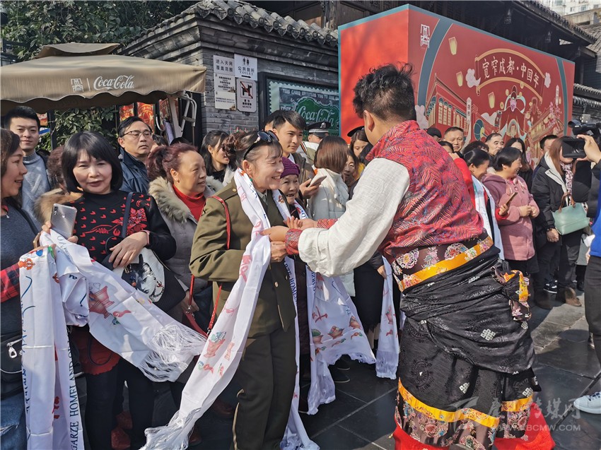 快閃還未開始,20名身著少數(shù)民族服裝的藏族姑娘小伙,便成為了一道最獨(dú)特、亮麗的風(fēng)景線。隨后,他們給游客們帶來了獨(dú)具甘孜特色的歌舞《康定情歌》《甘孜踢踏》,悠揚(yáng)的歌聲、奔放的舞步,讓圣潔甘孜大美天成的獨(dú)特風(fēng)韻完美展顯,吸引了春熙路如潮的人群,被歌舞魅力感染,不少市民隨著他們一起唱跳了起來。而此時的成都寬窄巷子里,也正在演繹著一場震撼的“快閃”,四名穿著格薩爾王服飾的大將,身披鎧甲、手持刀劍,格外威武帥氣,市民和游客紛紛拿出手機(jī)拍照留念?!翱扉W”結(jié)束后,熱情的甘孜兒女為周邊的觀眾獻(xiàn)上潔白的哈達(dá),向他們致以美好的祝福,并誠摯歡迎他們到甘孜旅游。