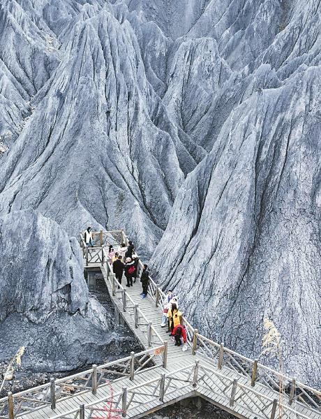 圖為11月27日,在道孚縣墨石公園,游客在素有異域星球之稱的景區(qū)游玩。