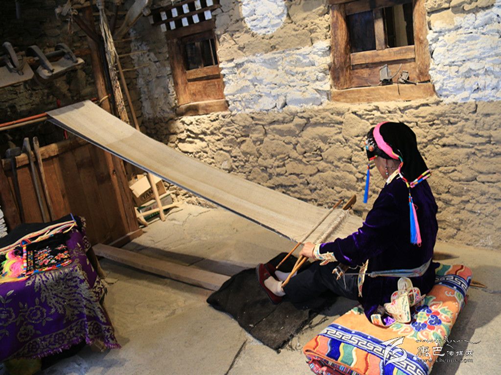 穿過古樸的大門,步入館中,映入眼簾的是古老的民間紡織技藝。一位藏族老阿媽端坐在古董般的織布機前,聚精會神地編織布匹,見到游人微笑回應,并未停下她手上的工作。年逾60的擁天秀,從十幾歲便學習織布,此間從未間斷。隨著紡織機逐漸被淘汰,擁天秀已成為傳承這門古老技藝的“活化石”。非遺展示館開館時,擁天秀主動表示,愿在此地免費為游客展示丹巴紡織技藝。 “我喜歡丹巴刺繡和紡織工藝,平時在家里也會做,現(xiàn)在眼睛不很好,所以刺繡沒有辦法做了。游客們很喜歡在這里看我織布,他們有什么問題,我都會給他們講解。”古老的嘉絨紡織技術,通過擁天秀的雙手,漸漸被人們熟知,無數(shù)張游人與她的合影也被傳至網(wǎng)絡。經(jīng)她現(xiàn)場紡織,價值600元一匹的純手工布銷量也節(jié)節(jié)攀升,擁天秀研習多年的手工活在展示館中終于有了“用武之地”。