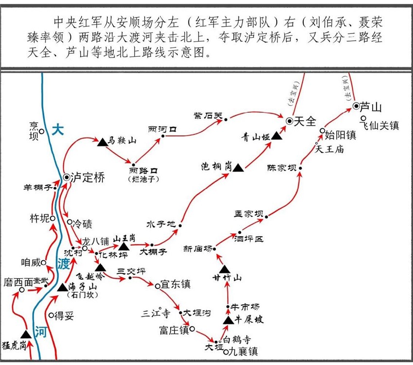 關(guān)于紅軍離開(kāi)瀘定后的具體行軍路線,聶榮臻同志后來(lái)曾經(jīng)回憶:“我全軍過(guò)大渡河后,開(kāi)始想回過(guò)頭來(lái),南向清溪、富林,以扼阻中央軍渡河北上,所以我們1軍團(tuán)又在化林坪等地?fù)魸⑼耸氐诙€的四川軍閥河防部隊(duì)。以后軍委得知清溪有川軍守?cái)乘膫€(gè)旅,為了避免與敵糾纏,盡快與四方面軍靠攏。又命令我們繼續(xù)北上去占領(lǐng)天全、蘆山。”5月31日,飛奪瀘定橋的紅2師4團(tuán)不顧連日行軍作戰(zhàn)的疲勞,從瀘定趕到飛越嶺下,攻打飛越嶺。飛越嶺位于瀘定縣東南,是漢源和瀘定的分界地,海拔近3000米。山頂有一隘口,稱(chēng)為飛越關(guān)。此關(guān)是瀘定能往漢源、滎經(jīng)的道路,也是紅軍北上的必經(jīng)之地。6月1日清晨,紅軍發(fā)起對(duì)飛越關(guān)敵軍陣地的偷襲戰(zhàn),在付出30余人傷亡的代價(jià)后,成功占領(lǐng)了飛越關(guān)。