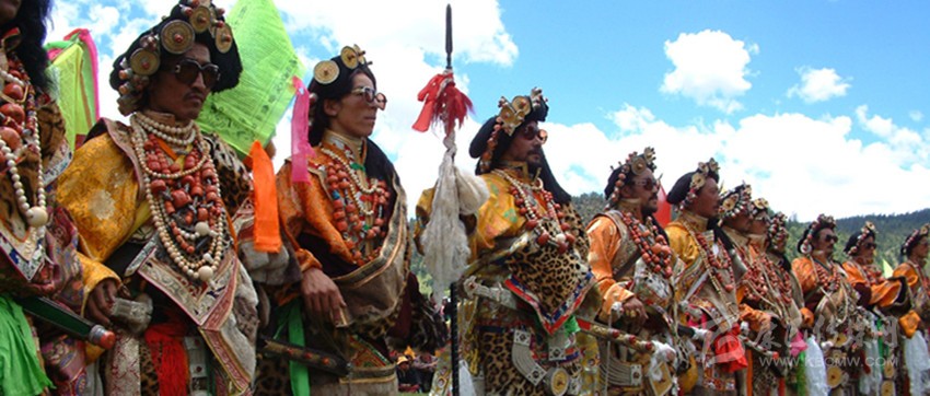 同時,因為康巴藏區(qū)雪峰林立,氣候寒冷。以號稱地球第三極地聞名遐邇??蛋腿嗣袷朗来驮谶@世界屋脊上過著“逐水草而居”的游牧和半牧半農(nóng)的生活。因而在服飾上也形成了具有典型的雪域高原民族獨有的地方風格特色。總體呈現(xiàn)出寬大粗獷、英武健美、豪氣颯爽的特點和大襟、寬腰、長袖、超長、無扣的特征。而色彩是康巴藏族服飾點綴美的靈魂,他們在色彩運用上十分著重色塊與整體的相襯與和諧,其運用最多的紅、黃、藍、綠、白、黑,往往包含了宗教的象征意蘊,又歸納了雪域大自然所呈現(xiàn)的直觀表征:他們認為藍、白、綠、紅、黃五彩是菩薩的服裝,藍色代表藍天,白色表示白云,綠色表示河流,紅色表示空間護法神,黃色表示大地。這是康巴人貼近自然的感恩之情和神性世界的精神延續(xù)的又一直接表達。