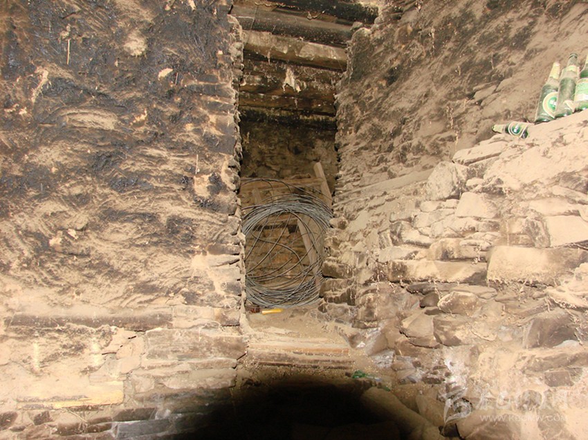 鍋莊房后,有兩道門(mén),其中一間為放置糧食的庫(kù)房。而另一間房屋,門(mén)檻高于鍋莊房許多,需要跨上兩級(jí)臺(tái)階才能上去。門(mén)較矮小,打開(kāi)房門(mén),一股潮濕的氣味撲鼻而來(lái),眼前一片漆黑,什么也看不見(jiàn)。我打開(kāi)隨聲攜帶的電筒,借助微弱的光線,勉強(qiáng)能看見(jiàn)房屋內(nèi)的擺設(shè)。房屋的右面角落里,有用木頭搭建起來(lái)的籠子,其高約一百三十厘米,寬約一百厘米。在房屋的左邊,有一曲折的甬道,也需要走上兩級(jí)臺(tái)階。牟大哥告訴我,這里是用來(lái)關(guān)押犯人的地方。