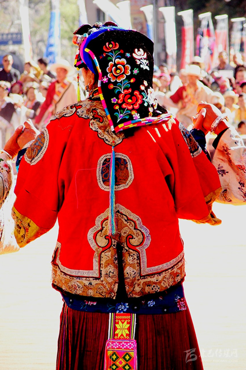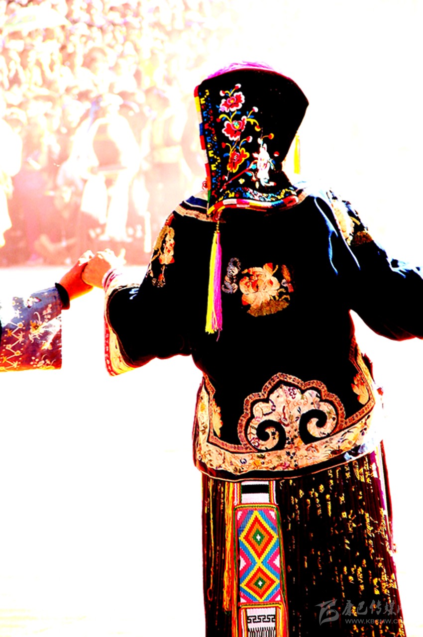 這些服飾雖歷經(jīng)歲月的滄桑,依然被完整的保存下來。如今,在上下宅龍村寨里,保存完整的有五十余套。每一年,村寨里舉辦活動(dòng)時(shí),村寨里的婦女們從木箱里取出這些服飾,小心翼翼地穿在身上,載歌載舞。在她們舞動(dòng)的時(shí)候,仿佛被這些服飾帶入幾百年前的時(shí)光里,時(shí)空在這一瞬間已完全改變。這時(shí)候,服飾上艷麗的圖案將舞者們襯托得更加美麗動(dòng)人,無怪乎《章谷屯志略》中有“逢慶典時(shí)著蟒衣文繡亦頗美觀”這樣的記載。