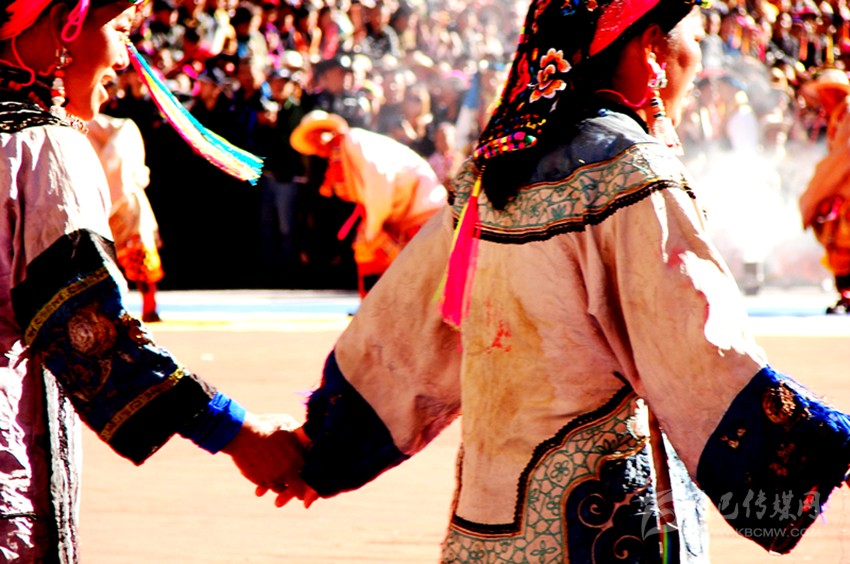 在婦女面前,腰部以下直達(dá)腳踝處,有寬約二十厘米左右的條狀絲綢布料,藏語稱為“仲巴”。這一條狀服飾,面料全部用絲織品制作而成。上面的圖案多為牡丹、杏花等花卉,也有龍虎、麒麟、雙龍、鳳凰等圖案的。裙擺外沿用絲織品鎖邊,絲織品上多有云紋,也有鮮花刺繡。顏色的搭配較為鮮艷,與中間的主題圖案之間形成一種強(qiáng)烈的對(duì)比,讓服飾之間的主次一目了然。