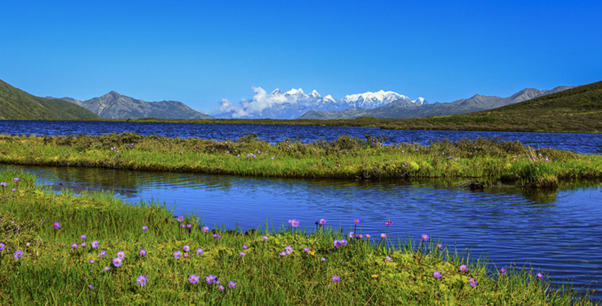 在山谷中穿行十余公里,路面一點(diǎn)點(diǎn)抬起,上了貢嘎山脈,徑直進(jìn)入康定情歌景區(qū)。隨著海拔的升高,涼意漸濃。山依舊是主角,地勢卻變得平緩而開闊,有茵茵的草地,有大小湖泊,沿途山泉潺潺,野花點(diǎn)綴,空氣清幽,方才單調(diào)的褐色很快被淡忘。山體漸次出現(xiàn)密集而低矮的灌木,枝條筆直地立著,有高寒山區(qū)的凜然之氣。灌木一層層上延,樹木雜多,大片的原始森林漫過山體,將大山包裹起來。遠(yuǎn)處,藍(lán)天白云之下,貢嘎雪山在群峰中探出頭來,擦亮高空的陽光。澄明的空氣里,仿佛可以聽見雪粒咯咯地笑。剎那間,仿佛所有的大山,都開始舒展筋骨。
