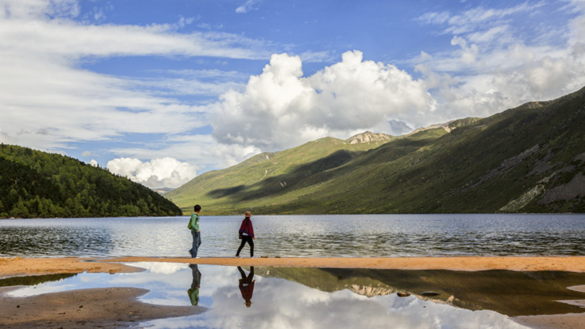 木格措特殊的位置和完好的生態(tài),造就了“一日四時(shí)景、早晚不同天”的自然奇觀。高原的第一縷晨光越過遠(yuǎn)峰,均勻地鋪灑在木格措湖面,湖水蘇醒過來,水面煙波浩渺,薄紗飛卷,如同早起后對(duì)鏡梳妝的仙女。午后有微風(fēng),遠(yuǎn)處湖面靜若處子,近前卻有微瀾拂岸,動(dòng)靜之間,盡得自然自在。斜陽西下,余暉投灑在水面上,湖水濃墨重彩,任意涂抹,水天一體,你我也融合在靜謐的湖光夜色中了。