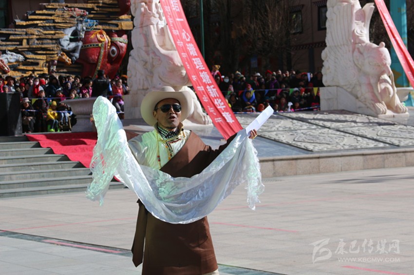 吉祥頌,藏語稱為“協(xié)巴”,是州級非物質(zhì)文化遺產(chǎn)之一?!皡f(xié)巴”在藏族民間生活中占有重要的地位,尤其在喜慶活動上,是一項不可或缺的重要儀式。州級非物質(zhì)文化遺產(chǎn)傳承人——高城鎮(zhèn)車馬村的翁堆老人手捧潔白的哈達,為觀眾表演了《協(xié)巴——中國夢、理塘夢》,展現(xiàn)了時代變遷中,“吉祥頌”這一民間藝術(shù)在思想內(nèi)容和藝術(shù)手法的創(chuàng)新之美。