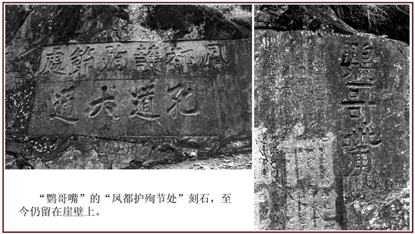 緊靠“鸚哥嘴”的,便是兩行從右至左、一上一下的橫書(shū)巨刻:“鳳都護(hù)殉節(jié)處”和“孔道大通”。它分明詔告世人,當(dāng)年那埸把康巴藏區(qū)鬧得個(gè)地覆天翻的大戲,便是從這里揭幕的。