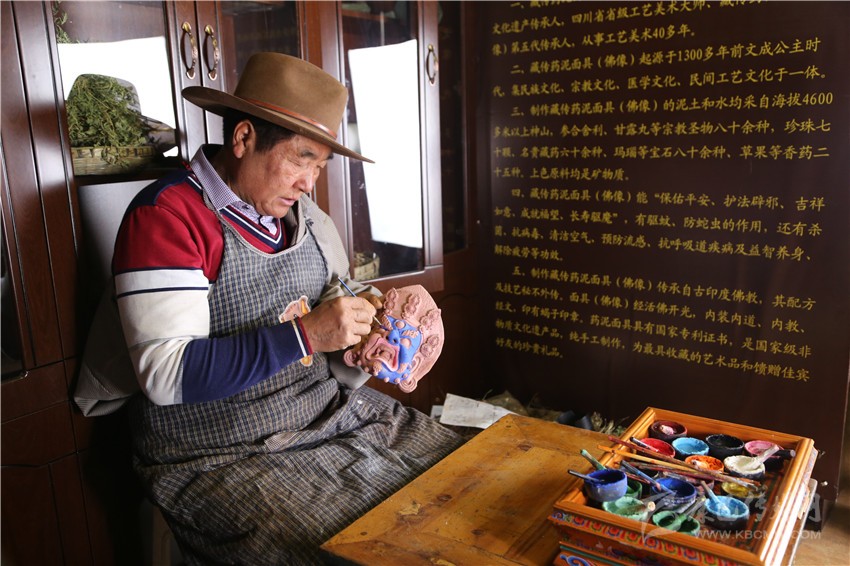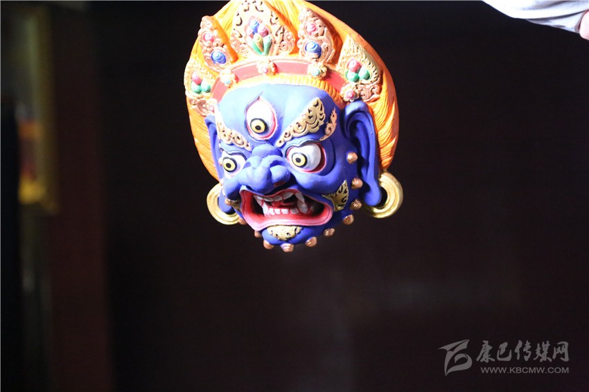 待面具自然風干后,用礦物質、植物的根等制作的自然顏料進行著色,自然顏料有不變色、耐光的特性,通過一淡、二濃、三淡的上色過程使面具涂色均勻,待顏料曬干后對面具進行磨光,去除雜物,再對面具進行裝藏念經(jīng),如此,一個藥泥面具制作完成。做好的藥泥面具有濃郁的藥材香氣,并有著驅蚊、殺菌、抗病毒、清潔空氣、解除疲勞等功效。