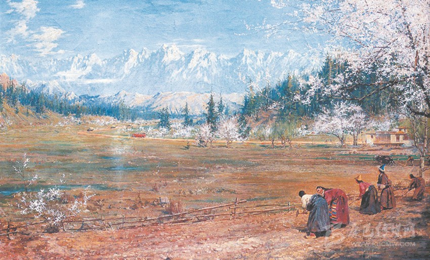 “西藏題材繪畫”主要是指內(nèi)地畫家從外部來關(guān)照西藏、表現(xiàn)西藏的繪畫作品。西藏題材繪畫經(jīng)歷了幾個不同的歷史時期:20世紀40年代,是內(nèi)地畫家初涉藏地采風,并在作品里反映青藏高原的風土人情,讓觀眾去想象西藏民族的生活狀態(tài)。而在50-60年代的西藏題材繪畫作品里,承載的是西藏的社會巨變,以及當時西藏人的時代風貌。從80年代開始的“西藏熱”聚焦于藏人對自然的尊重和敬畏,以及對“和諧共存”精神的贊揚等等。
