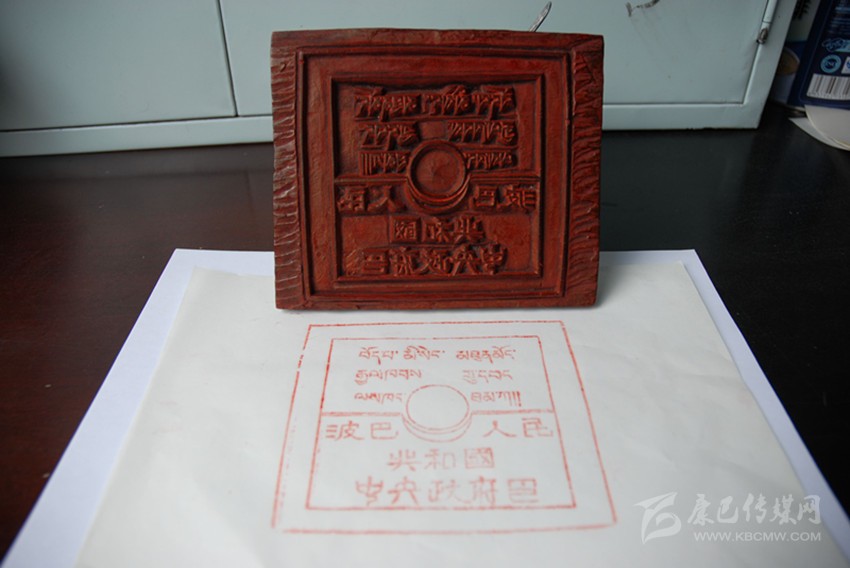 日月同輝的造型、藏漢雙語的文字,這一枚木質(zhì)印章,高1.5厘米,長(zhǎng)寬皆為12厘米,印面刻著藏漢雙語“波巴人民共和國中央人民政府印”。