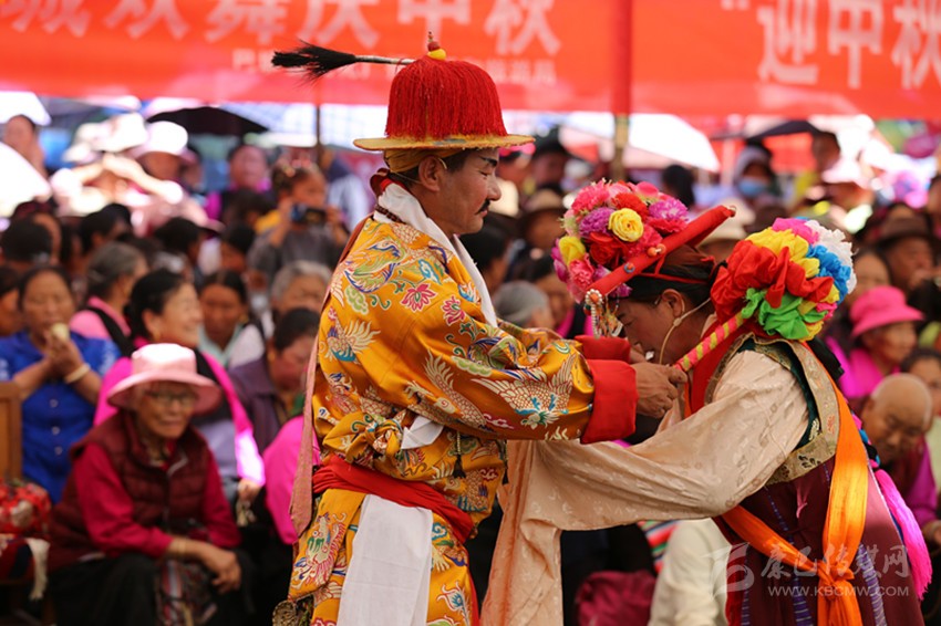 九月,龍王塘,藏戲《嘎拉旺布》演出現(xiàn)場。西繞反串花仙卓瓦桑姆,他頭戴花冠,頂上的三叉“巴珠”(后藏女人的一種頭飾)上插滿了粉色和紅色的絹花。身上穿著各色綢緞拼制成的無袖藏袍“拉姆切”,上套無袖彩條花氆氌帶和藍(lán)綠花緞帶連綴成的褂子。踩著鼓與鈸敲擊出的節(jié)奏,他的兩只腳進(jìn)、頓、點、退,舞步輕盈,手腕跟隨節(jié)奏,以頭部和肩部為限,左舞右蹈,用肢體語言表現(xiàn)人物的思想感情,這是該劇第一幕《定情月下》:湖畔仙景,卓瓦桑姆偕眾仙女婆娑起舞。國王隨仙鹿而來,向卓瓦桑姆傾訴衷情,花仙為國王的真情所動,愿永結(jié)同心。仙翁降臨贈箭祝福,二人辭別眾仙……。炎炎烈日下,西繞薄施脂粉的面頰已被幾行汗水弄花,但他不以為意,此時此刻,他不是西繞,而是花仙卓瓦桑姆。從進(jìn)場伊始,他便與角色融為一體。周遭的觀眾認(rèn)真觀看、解讀,現(xiàn)場一片和諧,最美的時光在這一刻被盡情雕刻。