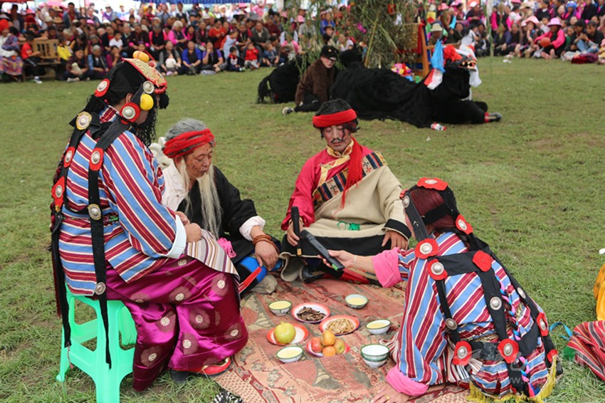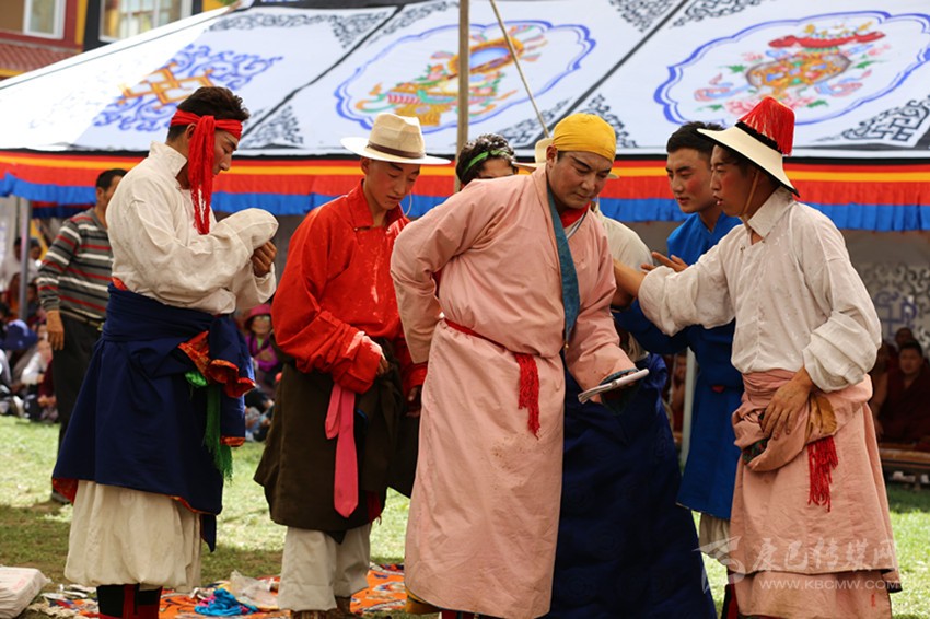 不過依照習(xí)慣,大家還是要募捐。誰家募捐了多少,藏戲團(tuán)會在“央勒節(jié)”的最后一天,即藏戲演出的尾聲“扎西交”上道謝。“扎西交”有幾層意義,祝賀本次“央勒節(jié)”功德圓滿,祈愿來年五谷豐登幸福安康,感謝上天賜予大地的恩惠。演員們向供奉在大帳篷中央的祖師爺唐東杰布莊重磕頭,把撒糌灑向天空,謝幕,“央勒節(jié)”便在熱烈的氣氛中結(jié)束了。每當(dāng)聽到話筒里喊出:“XX顧伙(顧伙:巴塘方言藏語,即搭帳篷的某一家),捐款XX元,道謝了!”時,大家都會生出不舍與惆悵之感,撤帳篷回家,日子又恢復(fù)到平常的瑣碎里了。