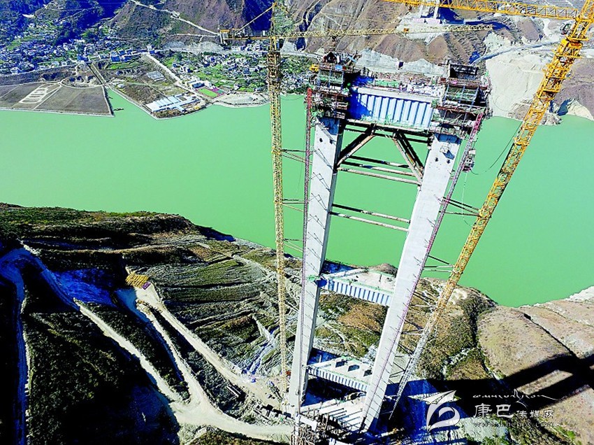 大渡河特大橋全長1411米,主橋是單跨1100米鋼桁梁懸索橋,抗震設(shè)計烈度9級,主塔橫梁采用波形鋼腹板,這是全國首個將波形鋼腹板應(yīng)用于高速公路橋梁索塔橫梁的工程。橋址區(qū)位于3個地震斷裂帶交匯處,處于大渡河干熱河谷,氣象條件多變,瞬時風(fēng)速最高可達每秒32.6米,相當(dāng)于12級臺風(fēng),施工難度大。為便于施工,施工方從318國道旁借道,建起3.5公里的便道,可從山頂?shù)竭_墩底建設(shè)點。受地形限制,便道呈“之”字形折返往上,成為一道獨特的景致。僅修建這條便道就挖了近12萬立方米土,若壘起來,相當(dāng)于一個長100米、寬100米、高12米的巨型建筑。