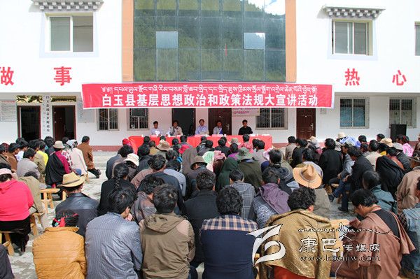 ?。冈碌陌子?,烈日當(dāng)頭,秋高氣爽。31日上午,絨蓋鄉(xiāng)政府大院內(nèi),白玉縣基層思想政治和政策法規(guī)大宣講活動正在這里精彩“上演”,400多名前來“聽課”的各村群眾正津津有味地品味著縣宣講團(tuán)成員松吉尼瑪通俗易懂的藏語大宣講。從黨的十八大到十八屆三中全會精神,從糧食直補(bǔ)到低保、新農(nóng)保,從養(yǎng)老保險、殘疾人幫扶到相關(guān)法律法規(guī),宣講者深入淺出,傾聽者全神貫注。