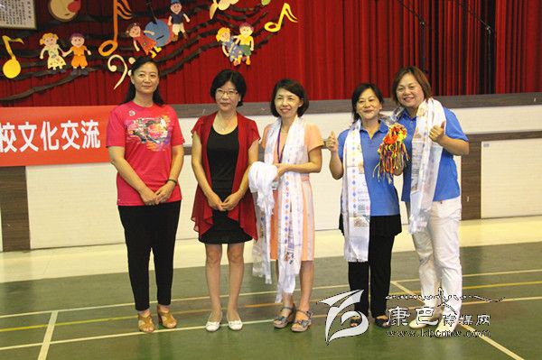 ▲巴塘縣委常委、宣傳部長張平樹,巴塘縣政府副縣長王文英向臺中市北區(qū)太平小學(xué)回贈哈達(dá)和吉祥結(jié)。