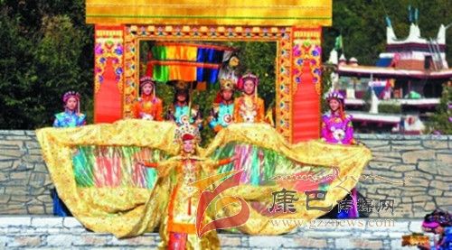 在催人奮進(jìn)的戰(zhàn)鼓聲中,一群身披甲胄的士兵拿著長(zhǎng)劍,背著巨弓走到臺(tái)前,在鏗鏘的戰(zhàn)鼓聲中,戰(zhàn)士們做著各種競(jìng)技動(dòng)作,模仿武士們互相攻擊的樣子,那矯健的身影展示了遠(yuǎn)古時(shí)代嘉絨藏族先民們?yōu)榱松媾c自然努力抗?fàn)幍膱?chǎng)景。過(guò)了一會(huì)兒音樂(lè)一轉(zhuǎn),戰(zhàn)鼓聲漸漸減弱,在鳥(niǎo)雀的陣陣啾啾聲中,一座木門慢慢的開(kāi)啟,一位身披長(zhǎng)袍、頭戴鳳冠的女王在眾多美女的簇?fù)硐?,緩緩走下臺(tái)階步入舞臺(tái)中央,此時(shí),一位手捧托盤的老者來(lái)到女王面前單膝下跪,將托盤高舉過(guò)頂,并邀請(qǐng)女王品嘗佳肴,女王將中指在酒中蘸了蘸,并曲起中指向四周輕輕彈去,寓意愿將杯中美酒與四方百姓同飲。在女王面前還放置著一個(gè)凈水桶,桶中盛滿了清澈的甘泉,桶上橫放著一枝柏樹(shù)枝,女王伸出纖纖玉手,拿著柏樹(shù)枝在水中蘸了蘸,面向墨爾多神山撒去,寓意向神山祈福。這是此次《美人谷·丹巴》節(jié)目展演中的序曲部分,有著強(qiáng)烈的東女神韻,將遠(yuǎn)古時(shí)代東女國(guó)女王遺風(fēng)展演的淋漓盡致。