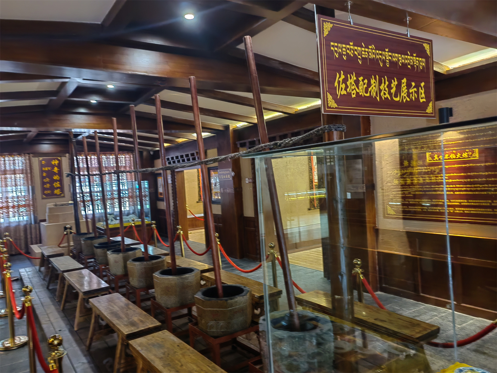 “這里是配制佐塔技藝的展示區(qū),中間黑色的粉末是已做好的成品,而周邊的‘八鐵八礦’就是做佐塔所需要的成分。整個(gè)炮制過程需要40余天、20多道工序,而且是24小時(shí)輪流換班,才能達(dá)到最佳”……德格縣藏醫(yī)院(藏醫(yī)藥研究所)講解員珠措邊走邊說。