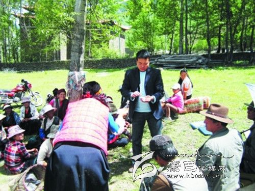 康定縣農(nóng)村信用合作社職工下鄉(xiāng)宣傳信貸政策,并對村民進行評級授信,發(fā)放小額農(nóng)戶信用貸款證。