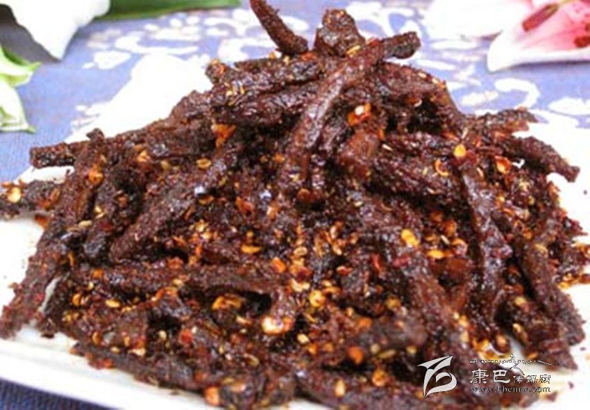 牛肉干以果洛藏族自治州生產的“雪山牌”最為著名。它是以新鮮牦牛肉為原料,取凈肉加白水煮熟后,切成小塊,然后加入花椒粉、咖喱粉、味精、料酒、糖、鹽等佐料干炒、烘干而成。香氣濃郁,滋味鮮美。