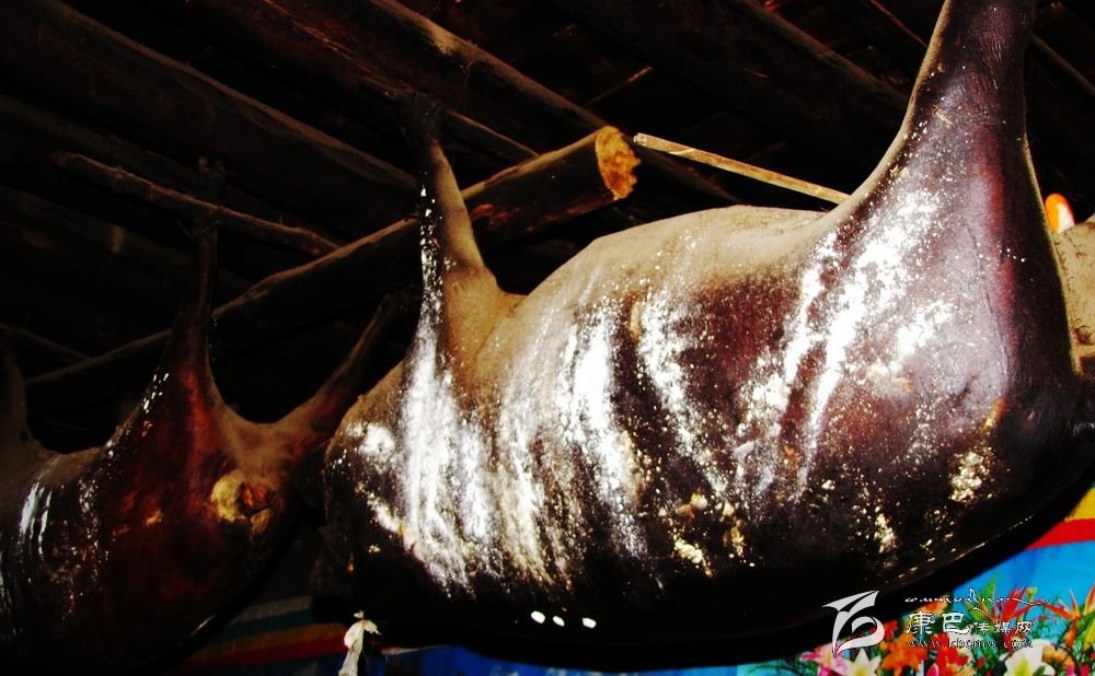 臭豬肉用扎壩語準確翻譯應譯“陳豬肉”或“舊豬肉”。由于其惡味乍聞重于“臭豆腐”,濃于廣東的“酶香咸魚”,所以稱“臭豬肉”。但扎壩人卻視之為上品,極其愛吃,并作為居家待客的最高珍品,家家戶戶都要熏制存放,且越存放得久越被視為珍貴,因此,在扎壩地區(qū),家中懸掛多少“臭豬肉 ”和懸掛的年限多少也自然成為當?shù)睾饬控毟坏南笳鳌?br />     “臭豬肉”的制作過程和來歷:豬用玉米和麥子喂肥后,用繩索套豬頸勒死,在其胸開一小口將豬心血脈弄斷,使肉中的血全部流回到內(nèi)臟中,再把所有的內(nèi)臟從小口中取出,并填上青稞、麥子等谷物后縫合,再用灶灰和紅土塞住七竅,把氣吹脹,埋在麥糠中10余天吸干水,取出掛在灶上的房梁上自然煙熏數(shù)年即成。其懸掛年限可達10年以上,最長的可達30余年。食用時,隨用隨取,做法也很多,可生吃,可煮食,也可熬湯。扎壩人多愛生吃,初嘗入口難適,多食后方覺滿口濃香,回味無窮。過去是為防備戰(zhàn)事而儲備食品,后來就逐漸成為當?shù)氐囊环N飲食習俗和主要食品了。