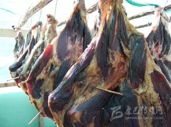 嘉 絨語稱“大古兒”,與香豬腿一樣,豬膘是丹巴的土特產(chǎn)之一。境內(nèi)居住在高山半高山一帶的藏羌群眾家家做豬膘。豬膘就是豬的肥膘做成的,一頭豬砍去四個“肘 肋”肉,去頭和項圈后,余下的從背梁上剖開,做成兩扇豬膘,在一鍋開水里煮成半熟,取出后,用木棍將其撐開弄直,在露天里凍兩天晚上,待基本成型后掛曬晾干。一般每戶人家在藏房的二樓有固定的房間放肉,在房間內(nèi)搭設(shè)一個架子,把豬膘平放在架子上,一扇重一扇。家庭富足的每年能積存一定數(shù)量的豬膘,幾年后, 已堆滿一個房間。豬膘的食用方法各個地方有所不同,境內(nèi)邊耳鄉(xiāng)一帶一般吃生豬膘,每當寨子里有人家蓋房、辦喜事,會提前做很多火燒子饃饃,切很多塊狀的豬膘;當天幫忙的一人發(fā)一個火燒子饃饃、一塊豬膘肉;豬膘一般不去毛,食用的時候在滾燙的茶水里浸泡一會兒,然后用刀將皮毛去掉,然后和著饃饃食用。小金溝 一帶有用豬膘做“墩子”肉(又稱“坨坨肉”)的習俗,“墩子”肉是“九大碗”中的主菜,其做法是把豬膘切成塊,放上佐料,用文火燉耙,然后一碗一碗舀上桌食用,“登子”肉燉的時間越長就越香。境內(nèi)其他一些地方普遍把豬膘煮熟切成片和著饃饃食用。
