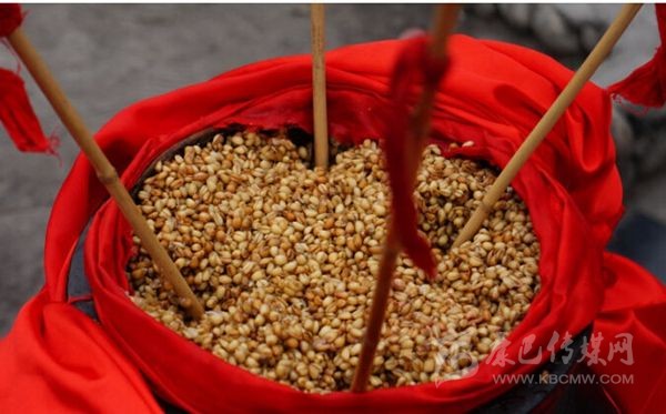 嘉絨語稱“恰鹵”。咂酒是青稞釀制而成的。首先取一定數(shù)量的青稞粒,一般5斤、8斤或10斤,在大鐵鍋中用水煮成八成熟后,放在簸箕里晾開,待冷卻后放上一定比例的酒曲,合勻,又裝入大鐵鍋中發(fā)酵三至四天,待聞到酒香味后,裝入壇中并加水,放置一天以上后,即可取汁食用,這個汁就是咂酒。咂酒味甘甜淳厚,十 分爽口,看似不醉人,但有的甘甜之中略帶苦澀,說明酒勁足,不勝酒力者應少飲為宜。曾有人寫《飲咂酒詩》說:“成石雜糧一甕收,王侯到此也低頭,五龍抱住 撐天柱,咂盡黃河水倒流”。充分展示了咂酒的魅力和飲咂酒的那種愜意。境內(nèi)巴底、半扇門的上半鄉(xiāng)、太平橋鄉(xiāng)一帶的群眾喜愛煮咂酒,平日,家家都備有咂酒,親朋間禮尚往來、人情世故都送咂酒。喝咂酒是當?shù)氐囊淮罅曀??!墩鹿韧椭?略)》記載了清朝后期宅壟土屯區(qū)的飲食習俗時說:“夷人(封建統(tǒng)治者對藏族的貶 稱)寨中置巨甕或木桶,富者大銅瓶盛酒,于內(nèi)植竹竿十余枝,跌坐于地互相吸飲,不杯杓勸酧(酬),無餚核(指熟食的魚肉干果),惟各布豬膘、牛肉、‘得木 鳥’(火燒子饃饃),醉飽而散”。現(xiàn)在,巴底鄉(xiāng)、半扇門的上半鄉(xiāng)、太平橋鄉(xiāng)的大多數(shù)村寨仍然保留著這些習俗。在節(jié)日或慶典之時,在大壩子中間放一個大的壇子或木桶,里面盛滿含有酒糟的咂酒,然后插入麥桿數(shù)根,眾人圍個大圓圈跳鍋莊,口渴時依次吸之;或一人手持葫蘆,里盛咂酒,在眾人中依次轉(zhuǎn)之;或眾人盤腿 圍坐,傳一壺咂酒,稱喝“轉(zhuǎn)轉(zhuǎn)酒”。