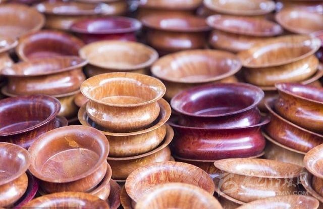按藏族傳統(tǒng),一般人使用得最多的餐具是木碗。木碗一般用樺木、雜木雕琢而成,質(zhì)地結(jié)實(shí),不易破裂,花紋細(xì)膩,較為美觀。木碗的制作過(guò)程,一是選材,二是風(fēng)干,三是制坯,四是細(xì)磨,五是上色。藏族木碗可分為大碗、小碗、蓋碗、套碗、木缽等多種,用途廣泛,可供喝茶,吃糌粑,存放食品、香料、佐料等,而且還具有光滑、細(xì)致、美觀、適用、不變味、喝茶香、攜帶方便等特點(diǎn)。雜木碗還有防毒的優(yōu)點(diǎn)。至于純金、純銀做成的勺子、筷子、碗和盤(pán),雖然在民間也能見(jiàn)到,但畢竟不是被普遍使用的生活用品,一般給客人奉茶都使用瓷碗。