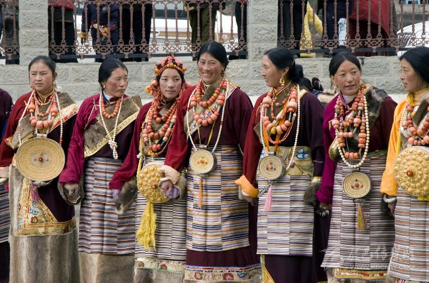 被稱為“瘋裝”的鄉(xiāng)城婦女服飾,最初形成于文成公主進(jìn)藏時期,于云南麗江納西族木氏土司統(tǒng)治時期定型,并吸納納西族婦女穿的齊膝圍裙的形狀特點,它的特點是褶皺多,分內(nèi)折、外折各54個。左右胸襟分別鑲有紅、黃、綠、黑、金五塊三角形布料,它們分別代表福壽、土地、先知、牲畜、財富。瘋裝,寄托著把人間福氣都聚齊了的寓意。雙袖肘處鑲有一片彩色布料,占整個衣袖的三分之一,袖邊嵌一小塊寸許寬綠布。裙鑲約1厘米粗的紅色羊毛條;背部嵌1.5尺見方稱為“公熱”的墊背。