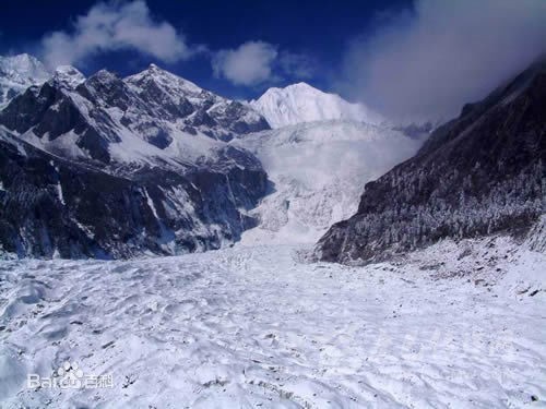 沿冰川上行三公里,繞過(guò)黑松林,即可望見這條大冰瀑布。冰瀑布寬達(dá)1100米,落差1080米,由無(wú)數(shù)極其巨大的光芒四射的冰塊組成,仿佛從藍(lán)天直泄而下的一道銀河。除非你親眼見到,沒有任何詞匯能形容它的瑰麗笥偉大。冰川最高點(diǎn)的海撥為6750米,而最下端的海撥高度僅為2850米,它不但是低緯度低海撥的冰川,而且是落差最大的冰川。