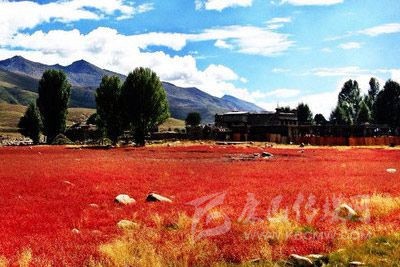 “紅草地”的后面是一個小村莊,村莊的周圍也有一些白楊樹,在秋風的熏陶下大都已變成金燦燦的黃色?!凹t草地”的四周被幾座大山所環(huán)抱。晚秋中,五顏六色的大片色塊亮麗張揚地組合在一起,水天同彩地纏綿出一幅斑斕、夸張、濃墨重彩的油畫山水。在黃綠相間的楊樹和藍天白云的映襯下,紅得特別的燦爛。一片只有足球場大的紅草地,每年只有十多天的風光,是成了稻城一個標志性景點。
