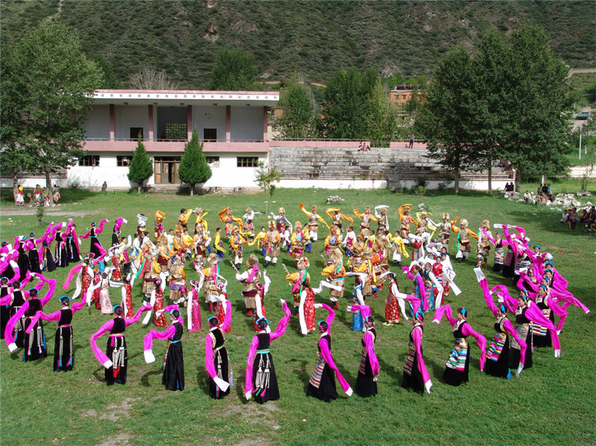 在舞蹈風(fēng)格上,甘孜鍋莊古樸舒展,尤其是快節(jié)奏階段,旋律熱情明快。男舞者動作粗獷雄健,女舞者秀麗活潑,具有鮮明的地方特色。