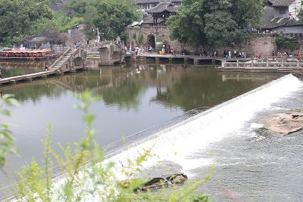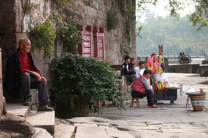 大榮橋。這座建在瀨溪河上、歷經(jīng)數(shù)百年的古石橋,一頭連著大足的地盤,一頭連著榮昌的地盤,故名??创髽s橋的最佳觀景點(diǎn)設(shè)在大榮寨對(duì)面的萬(wàn)靈山腰,從那里看大榮橋和橋拱那端毗鄰的大榮寨,一種看白描連環(huán)畫中古鎮(zhèn)的感覺,就冉冉升起了。