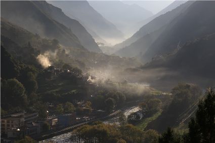 落日將最后一道霞光在山尖劃過(guò),暗夜便裹挾這寒意搖動(dòng)起山林中的樹(shù)木。風(fēng)漸緊,那已經(jīng)稀稀落落的樹(shù)葉隨著風(fēng)的韻律,跳起歡快的鍋莊,仿佛在告別這一年的繁華。突如其來(lái)的大雪,給丹巴的二月涂上白色的記號(hào)。從山尖到院前的樹(shù)上,一溜兒雪白,正應(yīng)了“忽如一夜春風(fēng)來(lái),千樹(shù)萬(wàn)樹(shù)梨花開(kāi)”的情景,讓人忍不住伸出手指看看這花是真是假。大雪過(guò)后,陽(yáng)光如約而至撒滿(mǎn)藏寨,金色陽(yáng)光和蒸騰的白霧縈繞在雪白的山頭,與山下的古碉藏寨,河畔的清流巧妙地構(gòu)成一幅絕美畫(huà)卷,讓人仿佛身處仙境。吸足了養(yǎng)分的柳樹(shù)終于抽出綠芽送來(lái)春天的信號(hào),那柳條兒在細(xì)風(fēng)吹拂下宛如少女對(duì)鏡梳妝,在陽(yáng)光下顯得無(wú)比溫柔,讓人不禁想貼近它們,感受這溫暖又靜謐的溫柔。