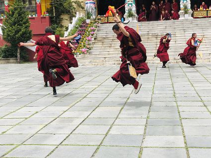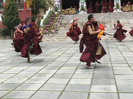 跳神儀式開(kāi)始,南無(wú)寺內(nèi)鼓號(hào)齊鳴,喇嘛身著顯耀盛裝,點(diǎn)燃新綠松枝,幾縷藍(lán)色煙紋升起。一支由法鼓、鈸、海螺、法號(hào)等組成的寺廟樂(lè)隊(duì)自大殿而出,順時(shí)針繞場(chǎng)一周落座場(chǎng)邊,群神出場(chǎng)繞圈而舞,以示凈化場(chǎng)地,祈請(qǐng)諸神入位。接著,象征護(hù)法神舞、骷髏舞、鹿神舞、黑帽咒師舞和金剛力士舞的演員手持各類法器挨個(gè)入場(chǎng)手舞足蹈。舞蹈的起落根 據(jù)場(chǎng)邊奏響的器樂(lè)節(jié)奏進(jìn)行。最后由眾神驅(qū)鬼逐邪,押送“朵馬”(由糌粑捏成用以供神施鬼的食品)至寺外拋丟焚燒,以示驅(qū)逐一年的邪魔,祈禱來(lái)年安樂(lè)。